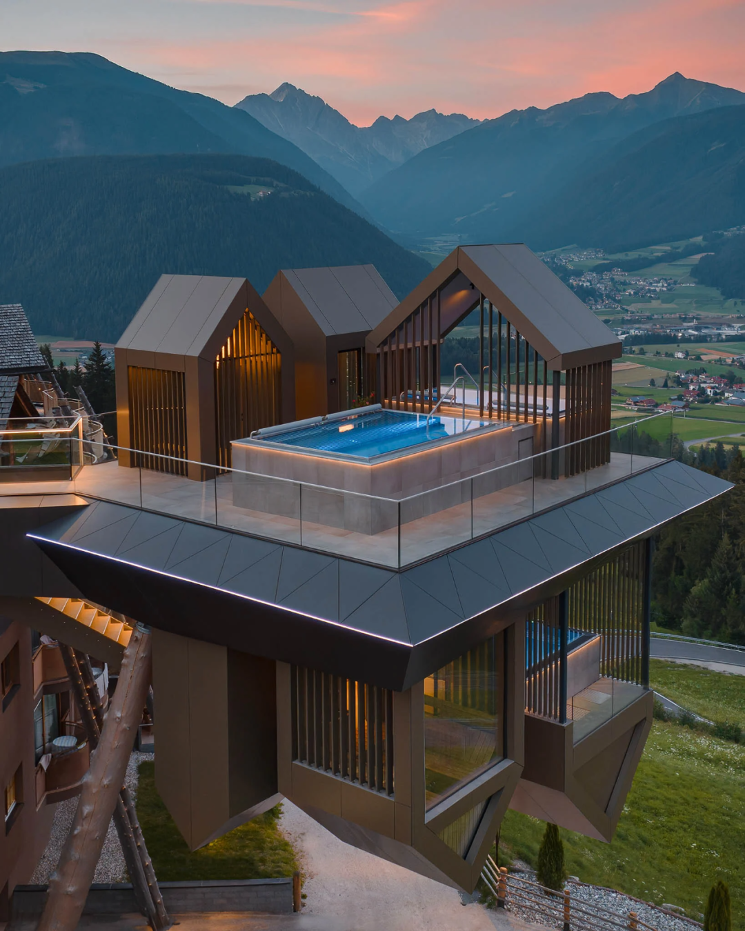 今年酒店在原有基础上增添了一座名为 Heaven & Hell的两层悬臂式结构温泉小屋,其下面倒挂的部分体量远远大于上面,增加了强烈的视觉冲击力。