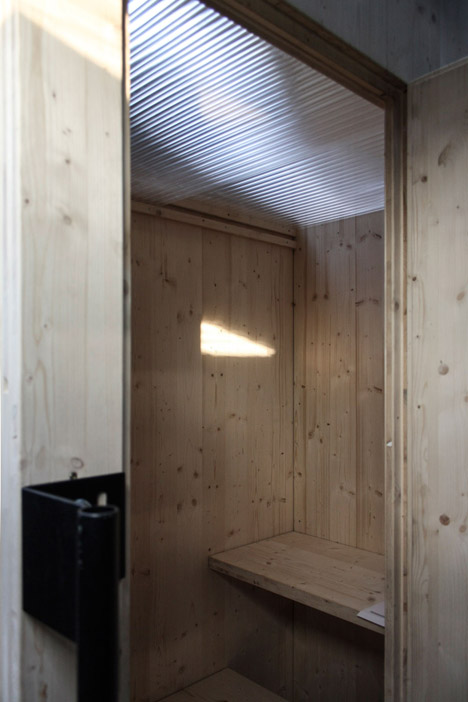 倾斜的棚状屋顶是用波纹聚碳酸酯和瑞士花旗松共同建造的,设计师用柚木油对花旗松进行处理以营造出一种中性未染色的自然外观,预制性的轻质木材更易拆装。