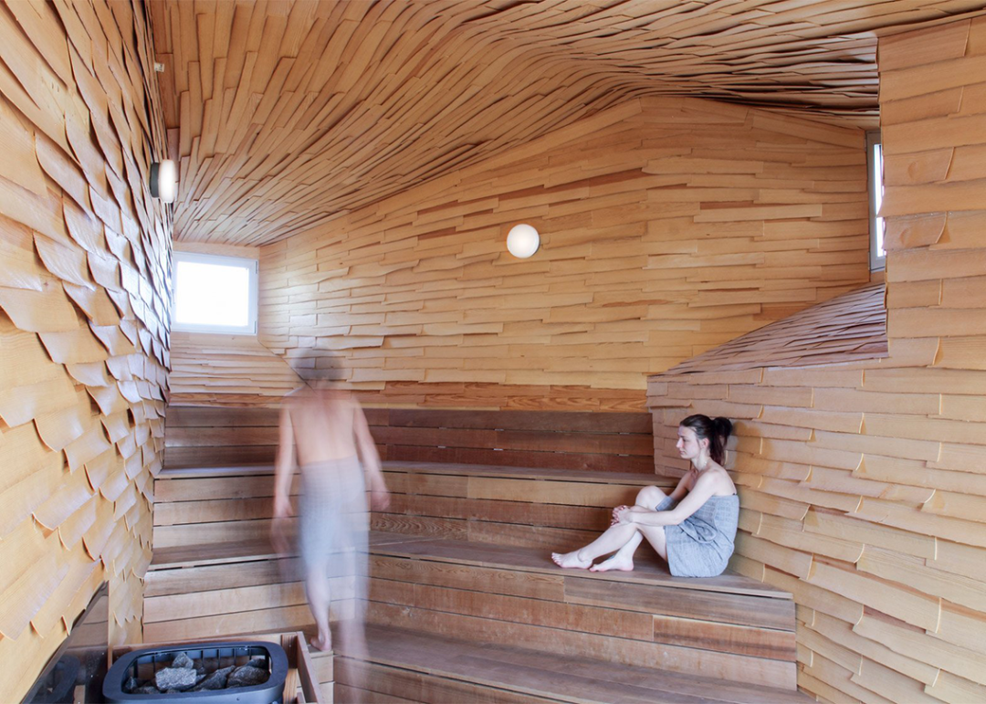 室内配有长凳和燃木炉,带肋的半透明玻璃设置在墙壁高处,利于光线充分让涌入空间,小巧的浴室为用户提供样舒适而亲密的桑拿疗程。