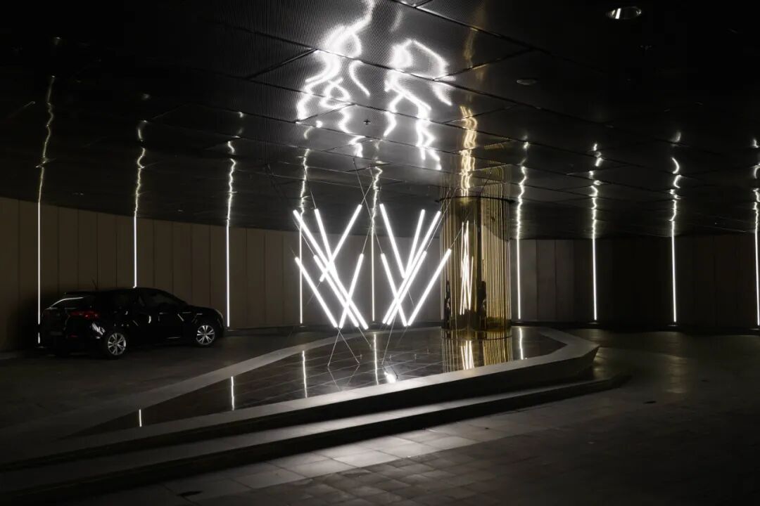 門口W標識的藝術品,四面呈不规则凹凸硬朗质感,以微缩视角还原月球表面层岩变幻、纹理斑驳的环形山地势群貌,流光溢彩的切割线,模拟飞行器飞梭于近月轨道的太空之旅。