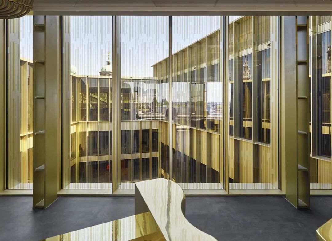 古法制作的有色玻璃和镀金层将外立面全数包裹,赋予了内庭院夸张的视觉冲击力。 ▽