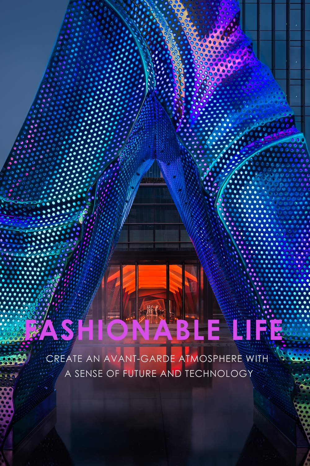 將"星"解構,剖分為點、線、面,並將其三維立體化,構成棱角鋒利,造型先鋒的門頭,散發著科技專屬的冷酷光芒,也讓人心生敬畏。