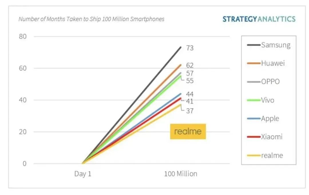 在品牌成立三年后,真我即成为全球最快实现1亿台销量的手机品牌,并且也是“亿级销量俱乐部”中成长速度最快的手机品牌。与之相比,苹果用了44个月,华为用了62个月,而小米也用了41个月时间。《壹观察》拿到的数据是:这1亿台销量中,数字系列占比近4000万,是真我品牌的“绝对用户支柱”。