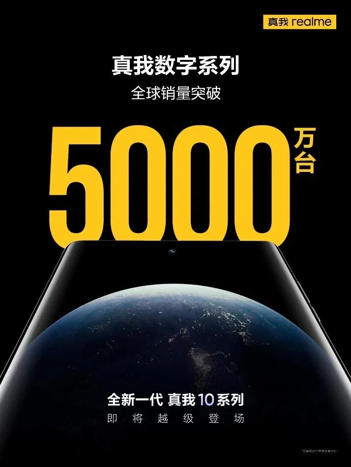 11月4日,真我宣布数字系列全球销量突破5000万台,而就在此之前的两天,真我数字系列正式官宣回归中国市场,真我10将在中国市场全球首发。