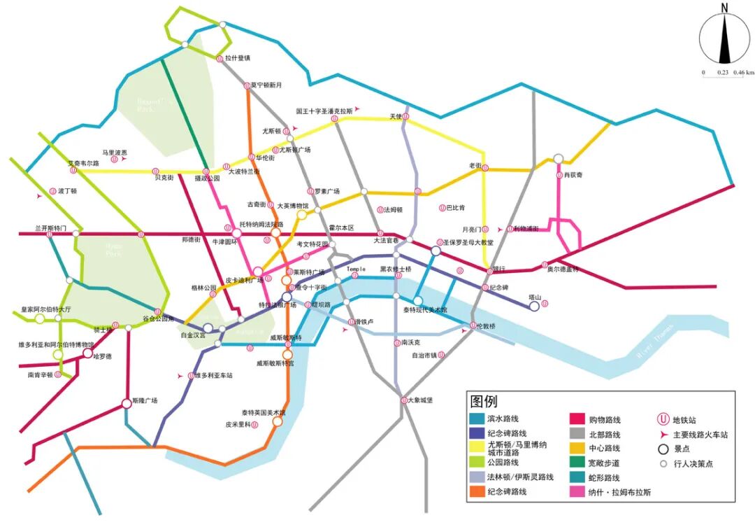 伦敦规划了7条风景宜人、有趣的步行路线,包括首都环线步行道、绿链、朱比利绿道、朱比利步行道、利亚河谷步行道、伦敦外轨道道路和泰晤士小路。沿着这些路线,人们可以探寻伦敦的景物,这些路线将城市的开放空间、自然保护区等特色资源串联起来,为居民提供宜游、宜赏、宜憩的步行空间。同时,通过连接关键节点,如车站、城镇中心等人流量多的地方,可以吸引更多行人。