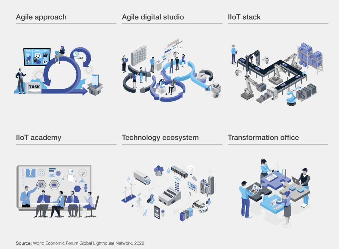 这里说到6大核心推动力,他们是这些灯塔工厂变革的力量: