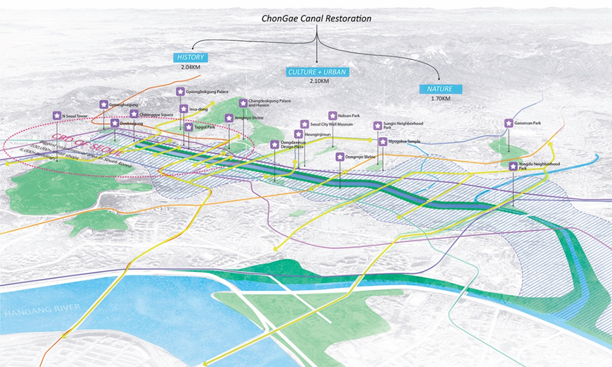 另外值得一提的是水源综合解决方案。清溪川的水源并非天然来源,而是大部分取自汉江水,将汉江水抽到清溪川上游补水,同时,通过地下水、雨水以及市政中水实现对清溪川水源的最大补给。