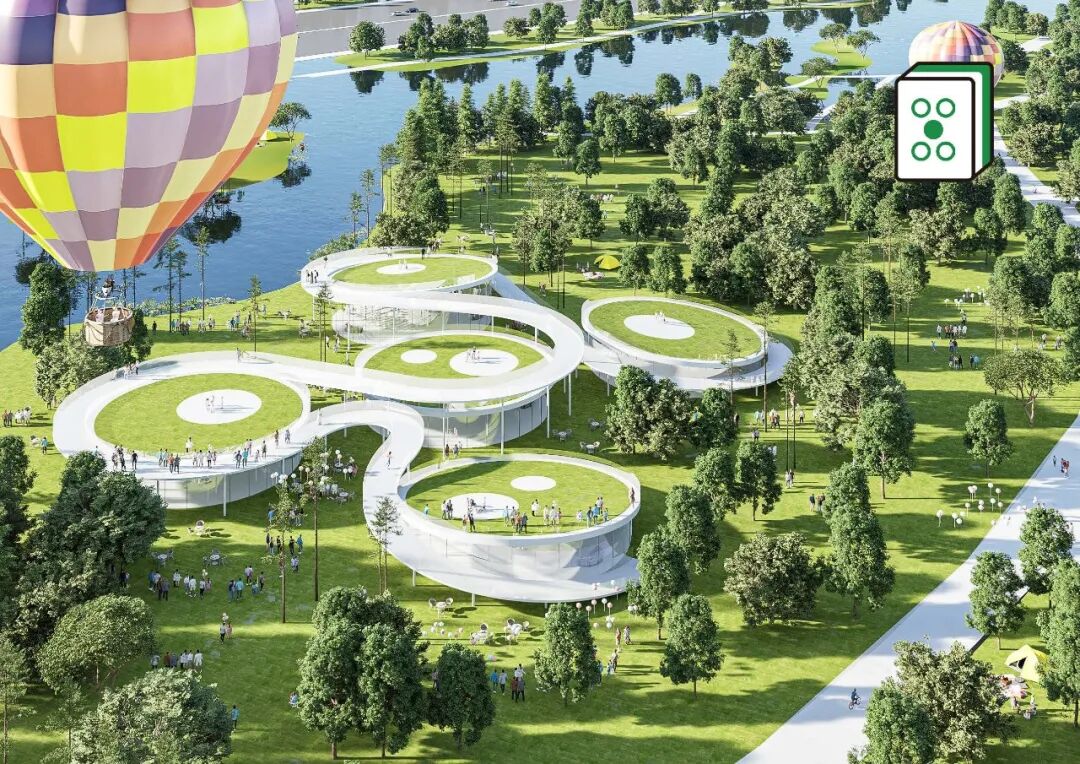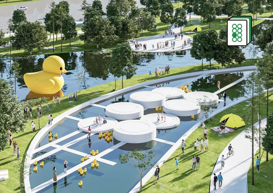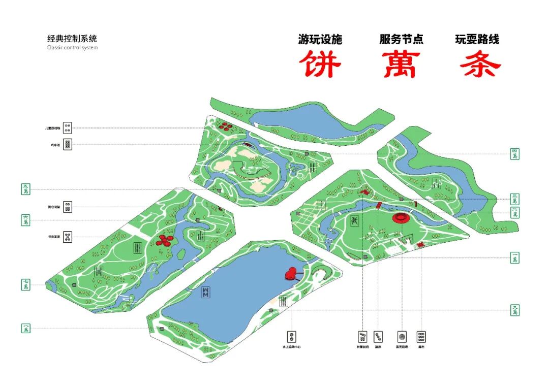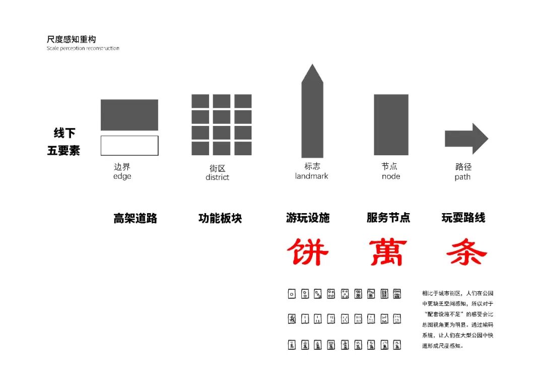 我们将经典的凯文林奇五要素和城市经典IP结合,重构了一套符合智能时代的认知系统。在蓉漂人才公园,高架道路塑造“边界”,大草坪大湖是清晰的“街区”,而麻将中的饼、万、条则用来定义原本模糊的“标识”、“节点”和“路径”。