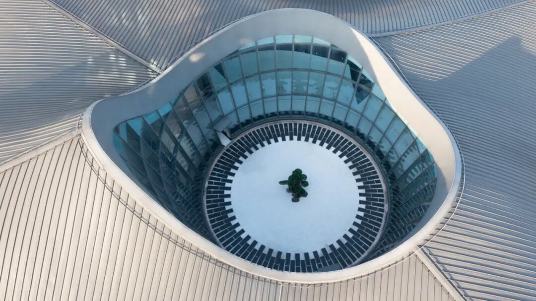 在屋面凸起的中间是朝向天空的留白,中空的圆不仅将光线与通风引入室内,更与下方的环形多功能报告厅呼应,让人文交流的场域与自然感悟的中庭,产生天人合一的精神,也构成建筑内外一体的布局形势。