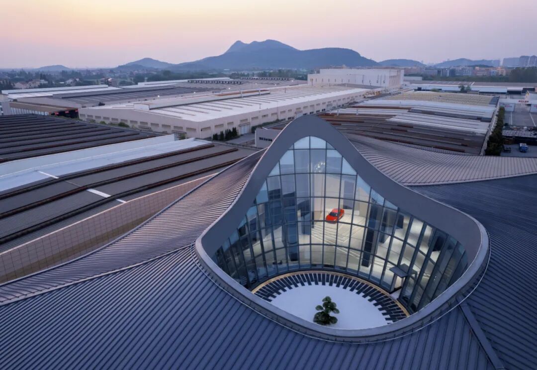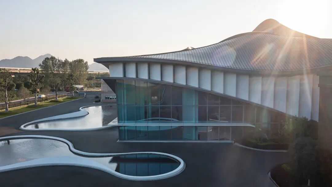 建筑体态由天圆地方展开,并借由超山、半山与临平山所环绕的山形,构成了流动的曲形概念,将建筑以方为基底,泥塑般的造型手法,提取而成了一种写意的坡屋顶,曲面屋面在一片厂区内宛若凸起的山谷,平衡了工业厂房与前方高架路桥的紧张关系,有如远方山体的延伸。