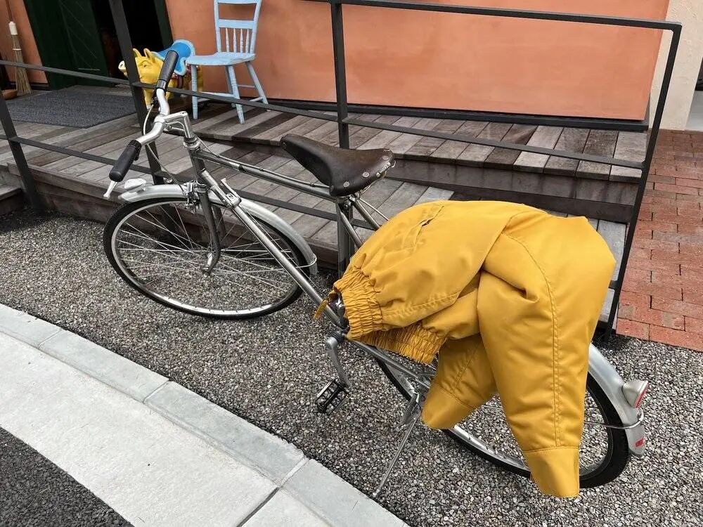地球屋门口,停着一辆眼熟的自行车,车上还搭着一件更眼熟的黄色夹克,仔细一看,原来是圣司的车子。