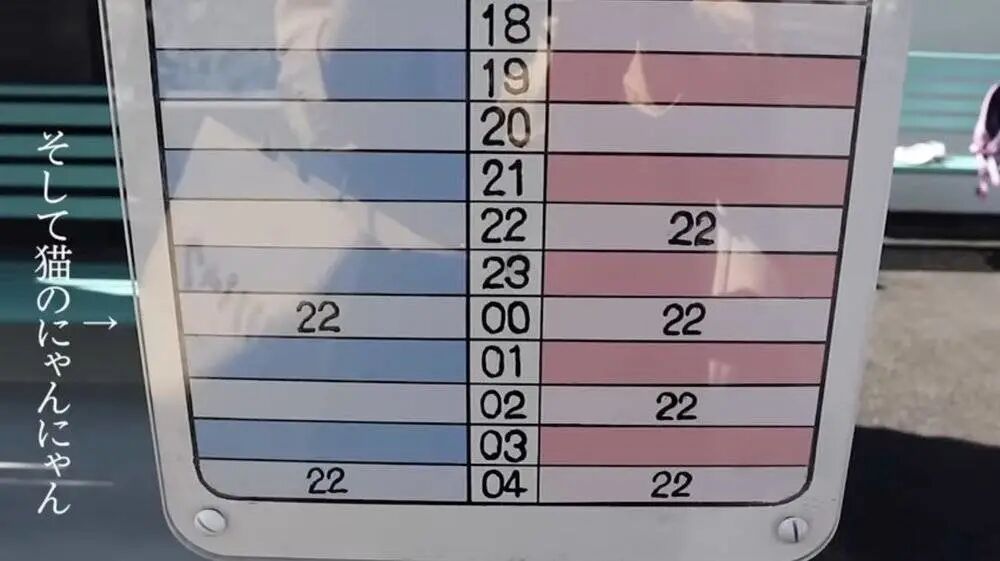 《龙猫》车站的站牌上,巴士时刻全部是夜间班车,抵达时间都是22分。因为这是夜间猫巴士的时刻表,22在日语里与猫咪叫声相似。