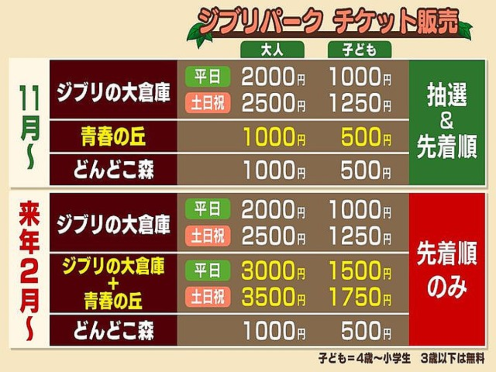 不过票价不贵,分区计价,面积最大的吉卜力大仓库成人票价最高2500日元(约合人民币122元),平日2000日元,其余两个区域都是1000日元。儿童半价,3岁以下免费。