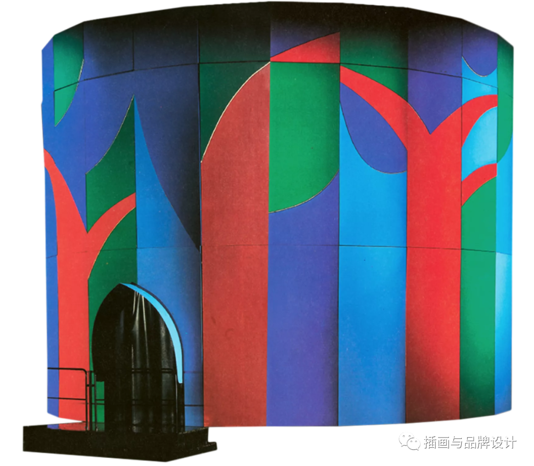 大卫·霍克尼为Luna Luna设计了一个圆柱形的小屋子,涂有红色、蓝色、绿色的木板拼凑在一起,将有机形式的复杂性降低为令人回味的几何形状。