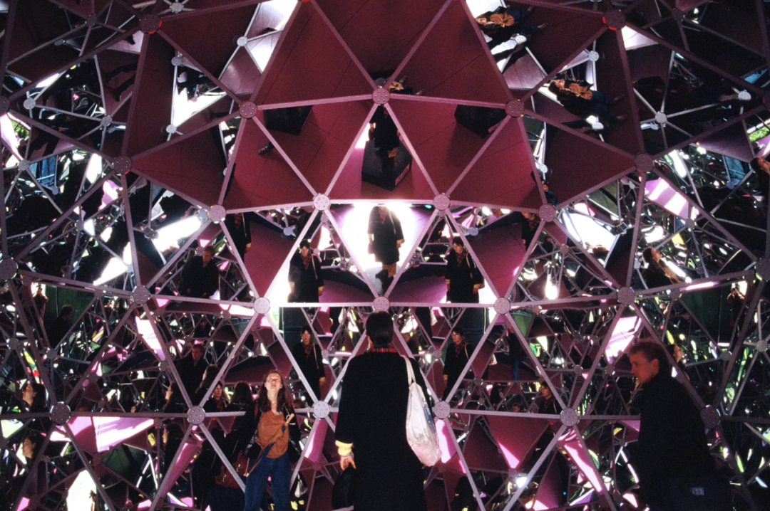 镜屋一圈是镜子墙面,上画着达利的作品。屋子的上半部分是用大小一样的三角形镜子拼凑成的球形。