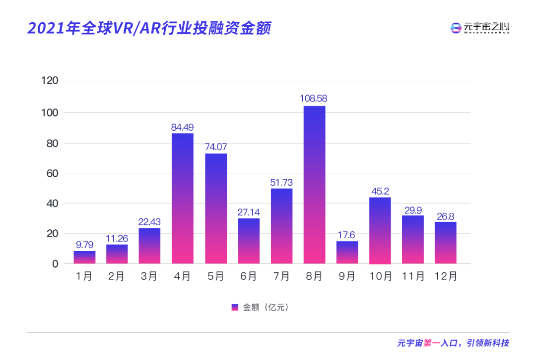 根据赛迪研究院发布的《虚拟现实产业发展白皮书(2021年)》显示,从投融资金额来看,2021年1-12月,全球AR/VR产业投融资金额达580.99亿元,远超2020年全年投融资总金额244亿元。