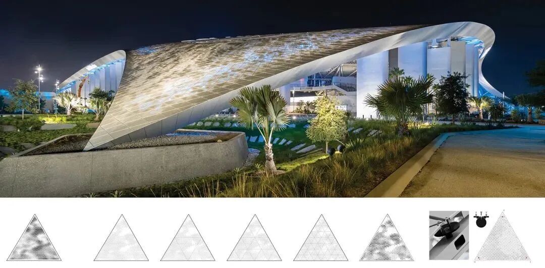 多孔天篷由超过35,000块阳极氧化铝板组成,每块铝板都有着独一无二的几何形状各不相同。