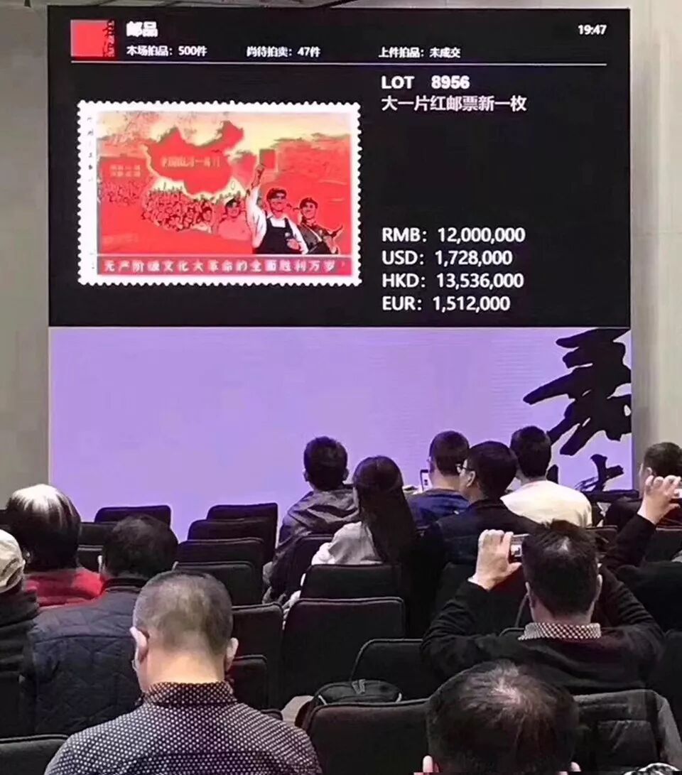 2012年,嘉德秋拍一枚“大一片红”经过20余轮激烈竞价,以730.25万人民币的价格成交,刷新中国单枚邮票拍卖新纪录。