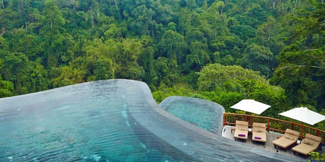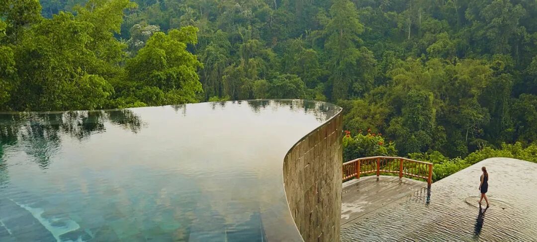 每栋酒店的别墅,都有自己的无边泳池,恍若悬浮在茂密的热带雨林上,让游泳者有一种漂浮在树梢的感觉。作为全球出镜率最高的泳池之一,它被多家杂志评为「巴厘岛排名第一的蜜月目的地」。