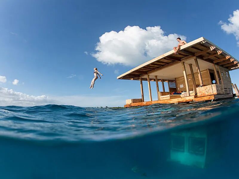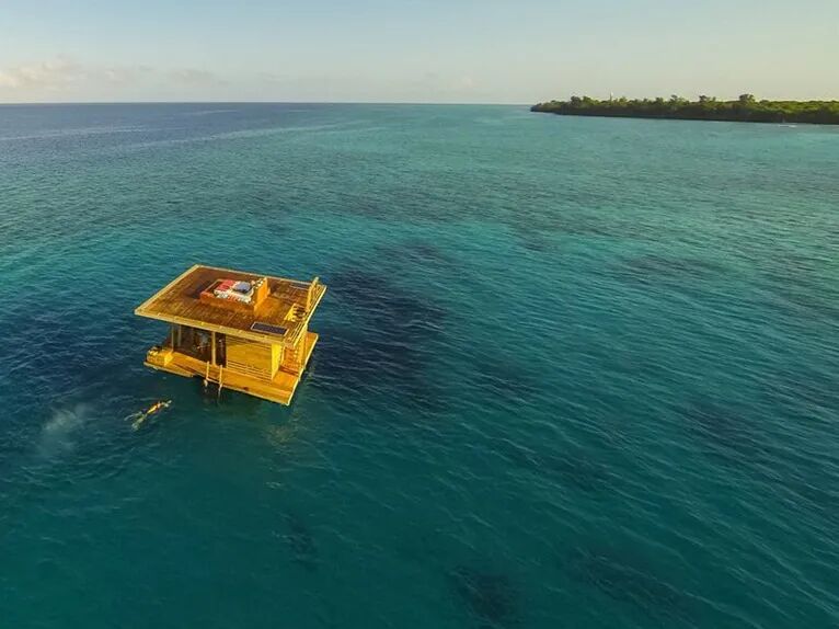 这座水下住宅,四面都是玻璃,被周围的海水环绕,漂浮在繁荣的珊瑚礁旁边,让住客可以近距离观察海洋生物。到了晚上,外部聚光灯吸引珊瑚鱼和章鱼,让水下生物的景色更加壮观。