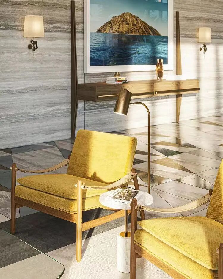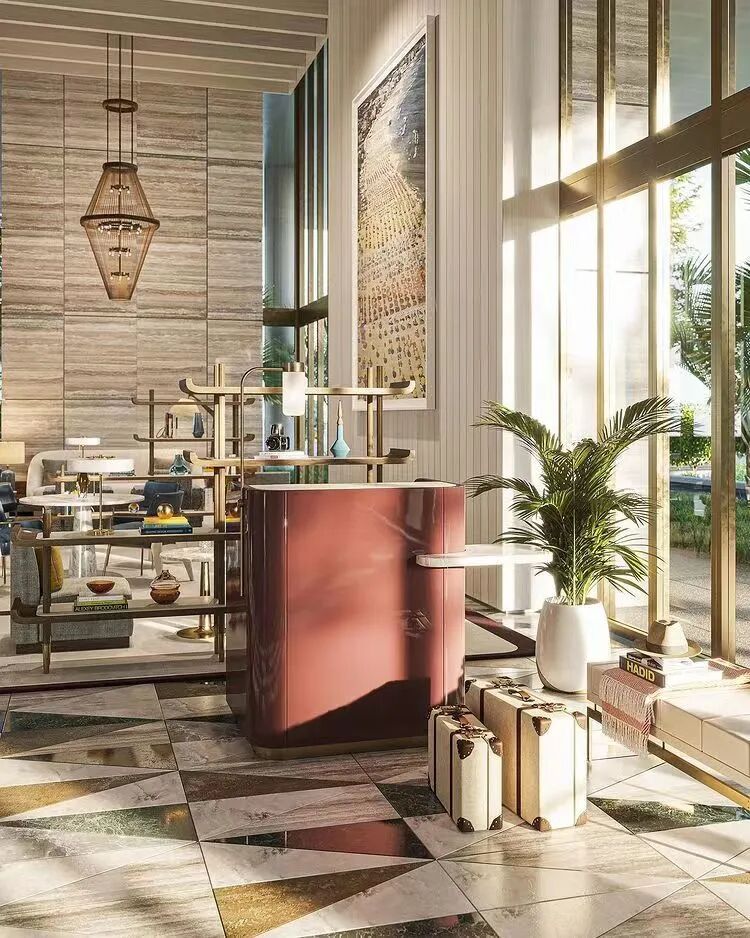 大堂金色的色调和 Gio Ponti 风格地板的运用,将时代的复古经典气质、装饰主义和当代性结合在一起,给人一种平静而精致的感觉。