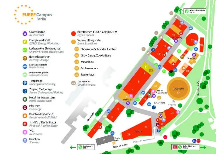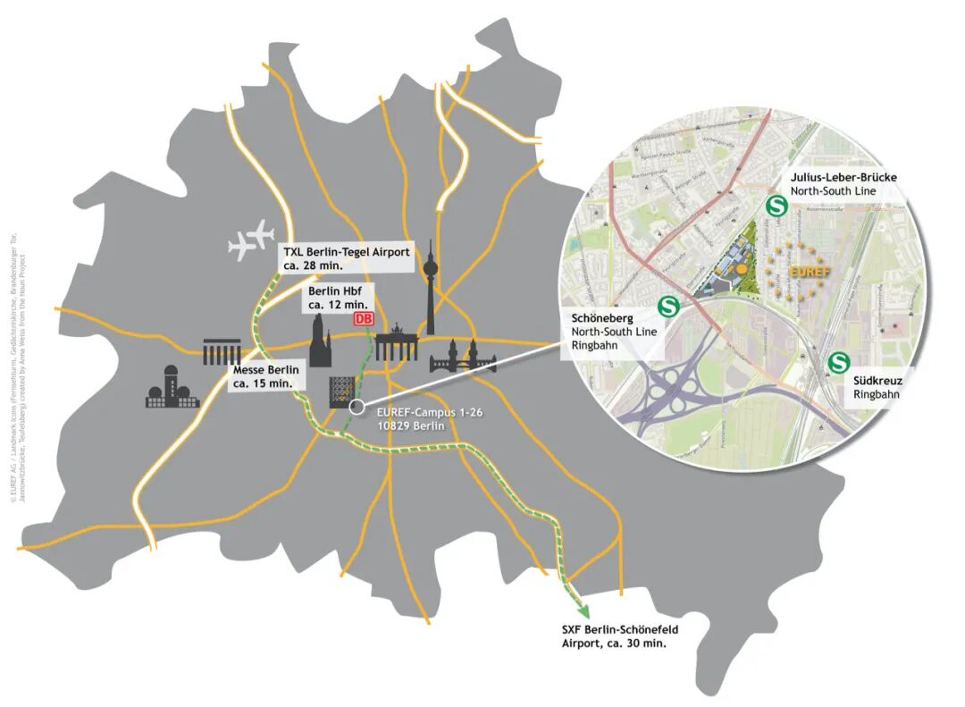 欧瑞府零碳科技园位于柏林市区西南方位,占地5.5公顷,有25幢建筑,150家创新型企业,近3500人入驻。100多年前这里是煤气站,也是当时最前沿的能源技术。