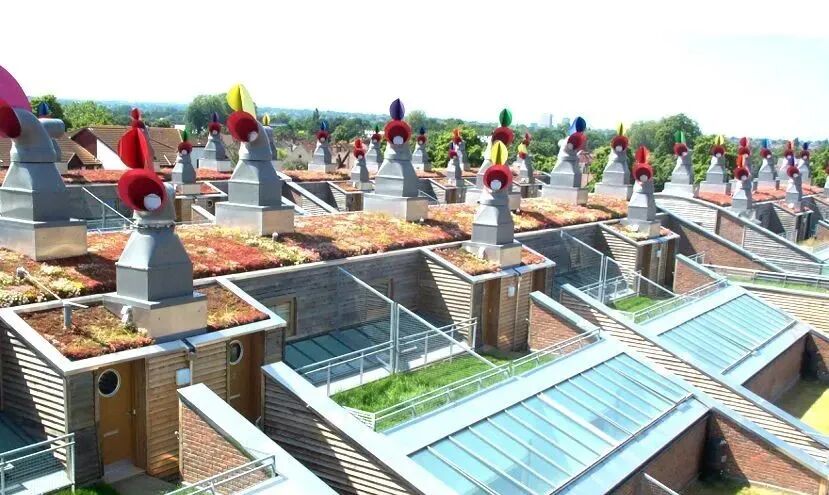 在英国伦敦南郊的贝丁顿小镇,有一个外观独特的社区格外引人注目,这里的建筑物上竖立着一排排五颜六色的烟囱状装置,屋顶南侧铺设了大片太阳能光伏板,北侧则种植着各色植物。