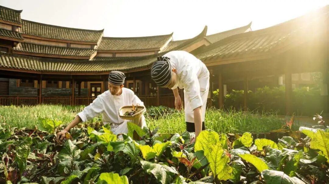 国内青城六善酒店开辟了菜园自产有机食材,客房饮用水全部使用循环玻璃瓶灌装。