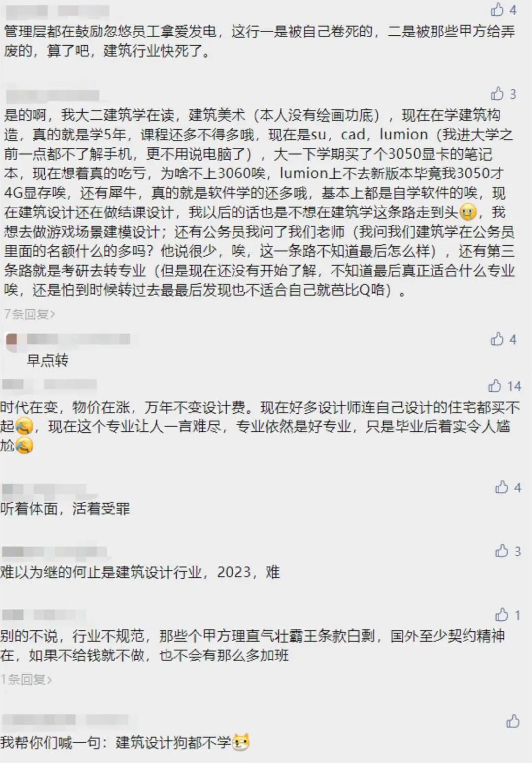 如今行业内卷如此严重,建筑行业的“高强度工作+低薪资回报”,也变成了众多建筑学生选择转专业的理由。