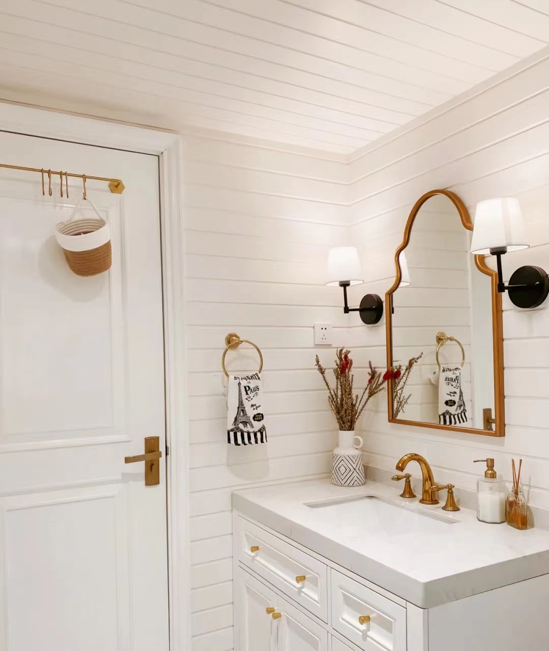 来到卫生间,小姐姐定制了纯白色生态木做墙面和吊顶,虽说不是特别容易清洁,但胜在美观漂亮。