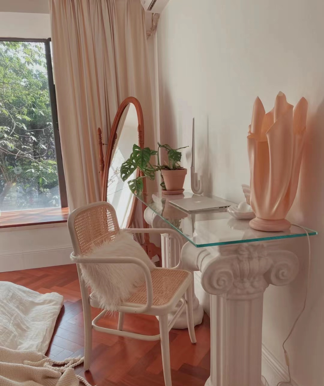 自制的罗马桌也很好看,采用石膏柱+超白钢化玻璃搁板,不仅能当摆件,也可以作为小姐姐工作的小书桌。