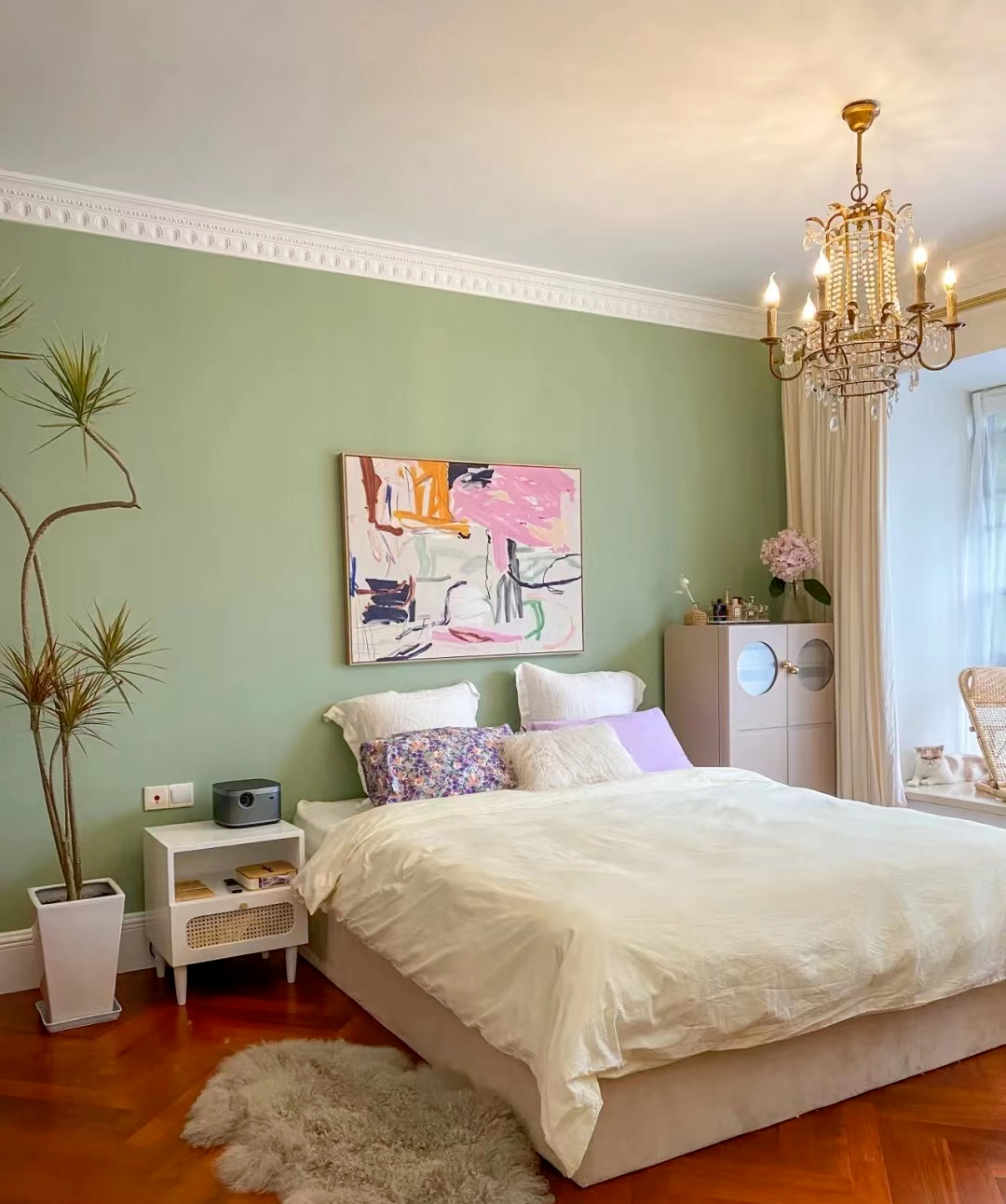 与全屋乳白色墙壁不同的是,小姐姐把主卧的床头墙壁刷成了豆蔻绿,并用石膏顶线和高的踢脚线做设计上的呼应。
