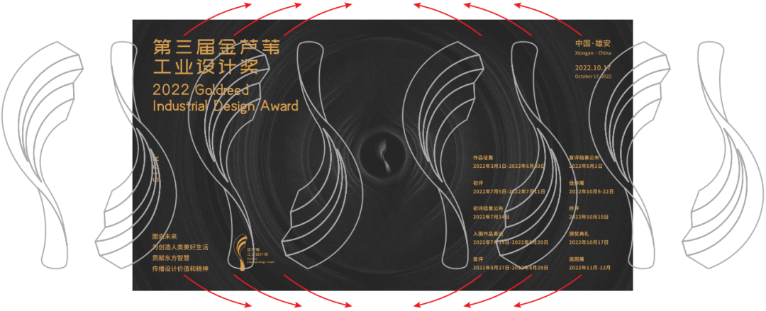 主视觉整体形状由金芦苇奖LOGO中的芦苇变化而来,设计师选取LOGO本体的不同点位,记录其旋转过程中的变化轨迹,得到最终圆形的视觉效果。
