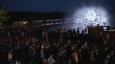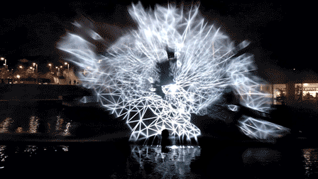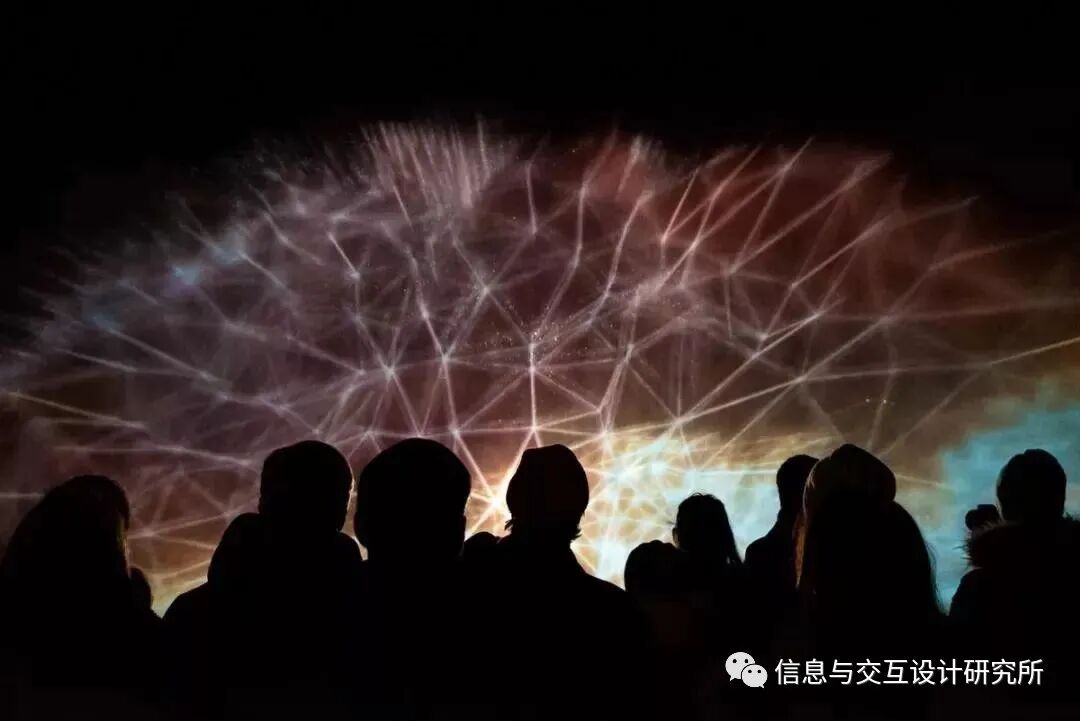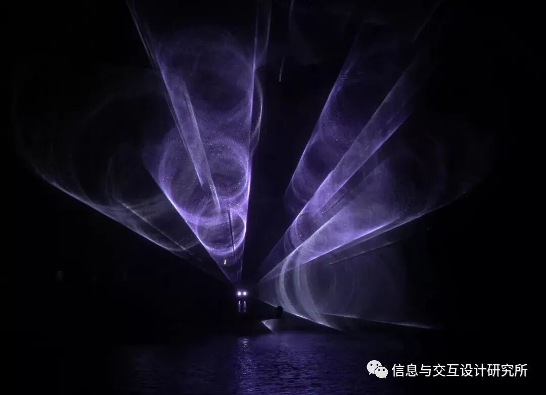 Joanie Lemercier 设计的户外视听装置“Constellations”,将三维灯光投射到水中,使它具有波纹的全息效果,结合电子音乐在空气中形成不同的形状和结构。