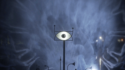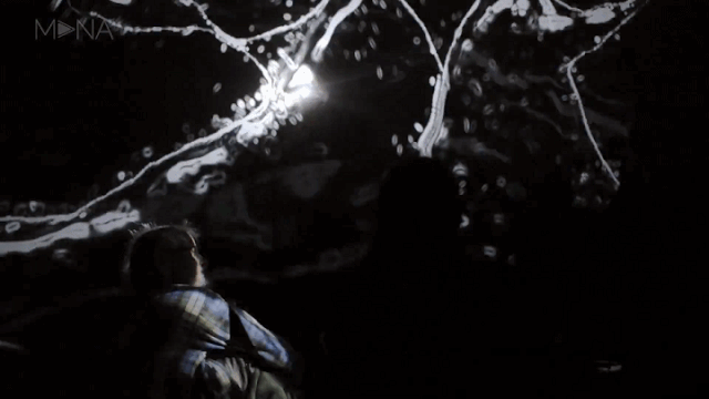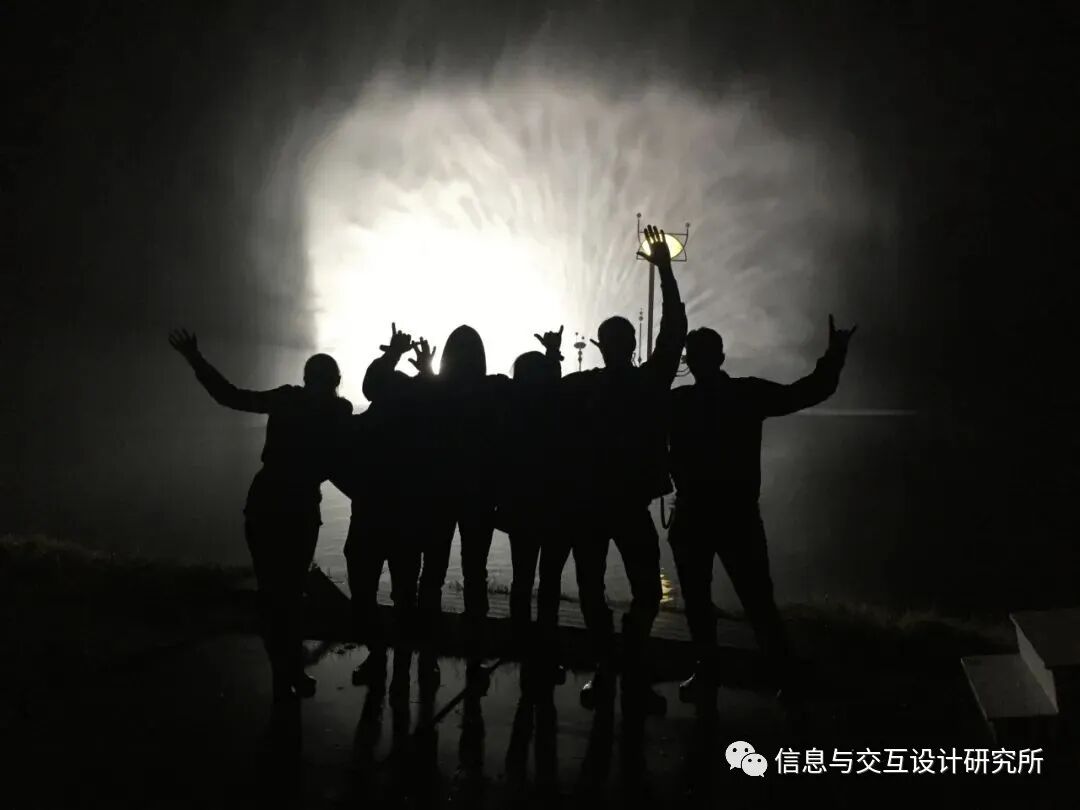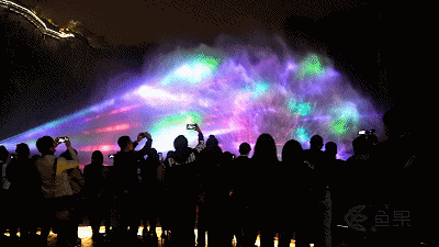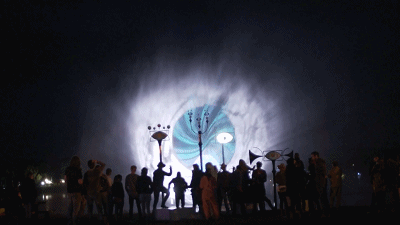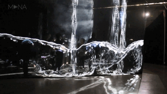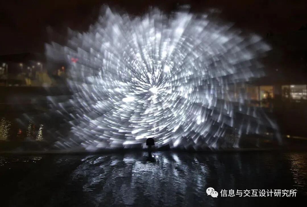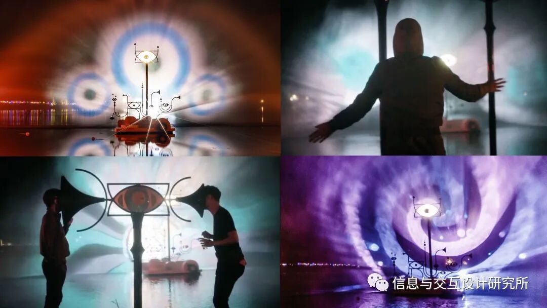 交互是这件作品Periscopista 的一大亮点,当参与者站在特定的位置前做动作,水幕便会对应出现更加酷炫的效果,除了动作还有声音,当参与者对着装置上的“喇叭”呐喊,水幕也会随着声音而改变,并且水幕影像中的动态人物的视觉效果中也是有故事的。