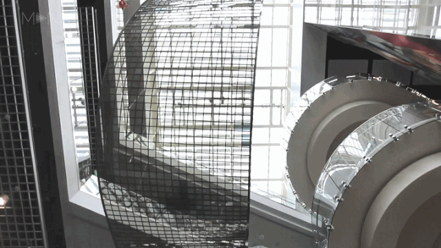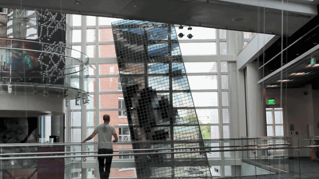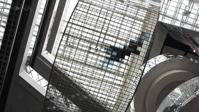 它由3600块液晶玻璃砖制成,每块玻璃砖的透明度改变,作品表面就会呈现出不同的动画效果,包括雨滴、菌落,群鸟、黑洞等等。