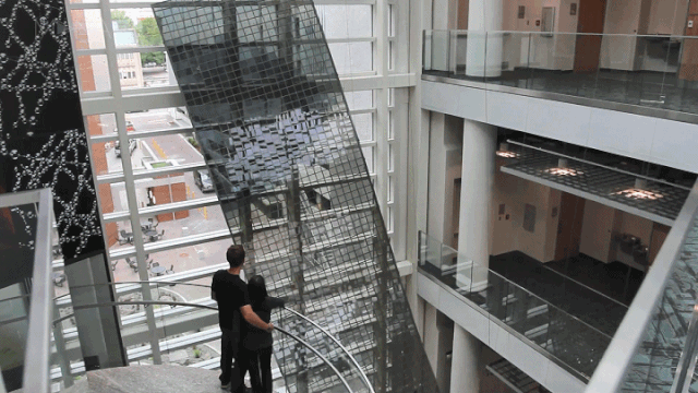 Patterned by Nature 全息装置展示于北卡罗莱纳州自然科学博物馆。这件宽10英尺,长90英尺的作品蜿蜒穿过博物馆的五层楼中庭。