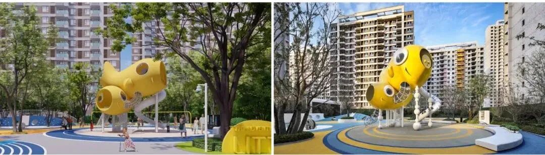 以嬉戏的鲤鱼作为场地的IP器械,结合攀爬网、滑梯、休息空间等组合有趣的游戏设施。