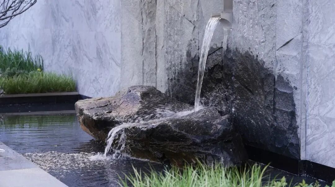 清澈的泉水簌簌地冲击在粗犷的黑山石上,动感的水流与静态的置石形成对比,质感的冲击增添空间的灵动感。