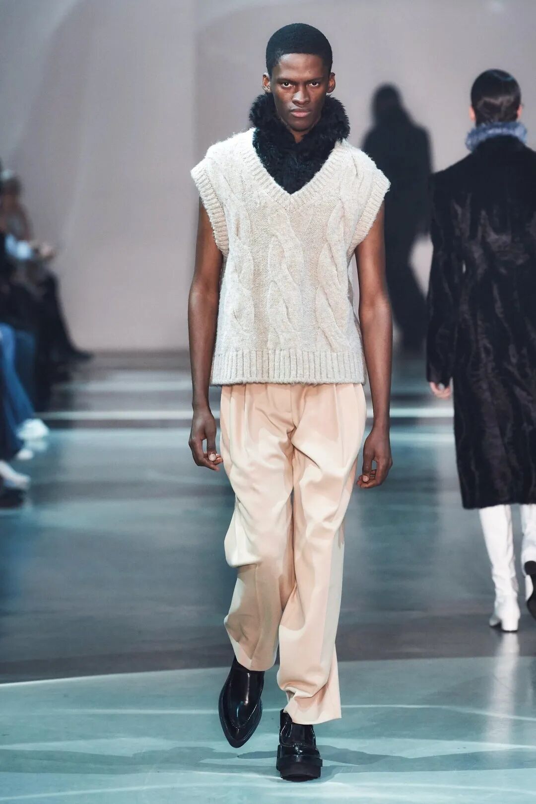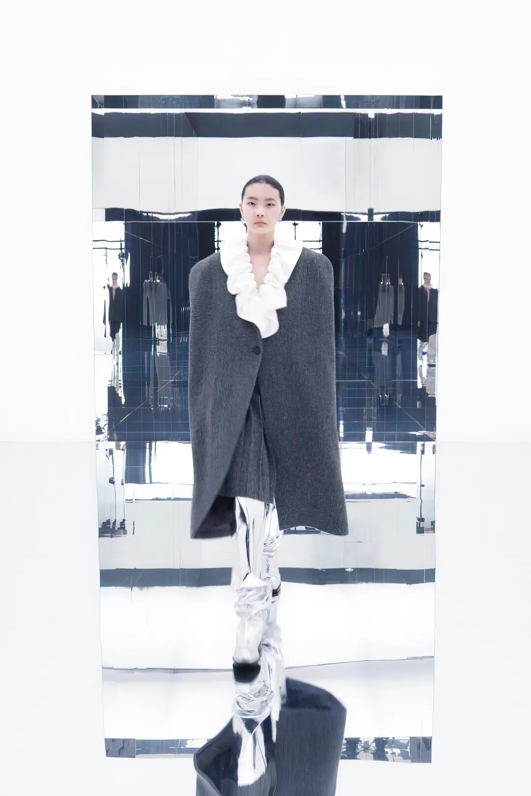 剪裁合身的夹克和羊毛披肩的圆润质感,带来了有趣的廓形。慵懒又实用的毛衣为Look增加实用性的同时,还注入了高级感。
