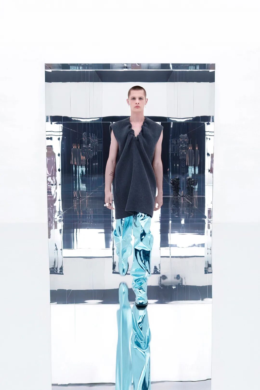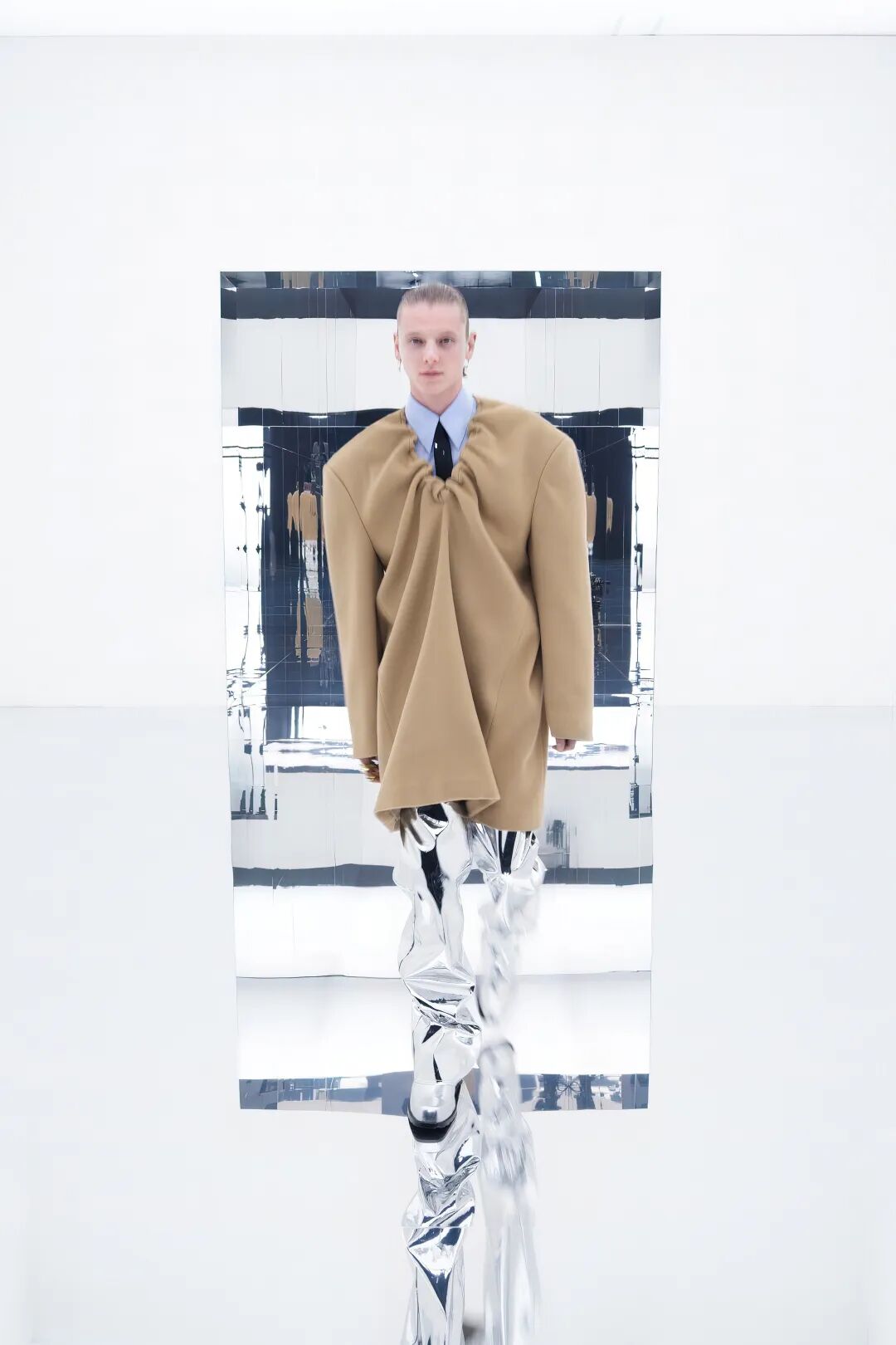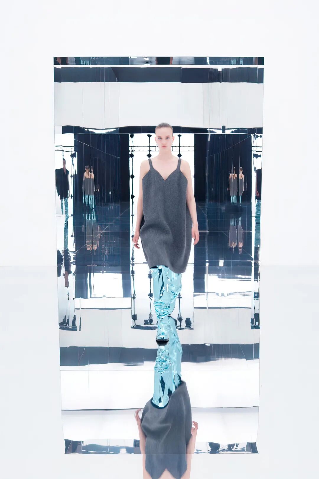 服装参考了17世纪Flemish的绘画,将富有科技感的夹克、羊毛套装、乙烯基长筒靴、无肩带晚装紧身连衣裙、雨靴等单品推到人们面前。