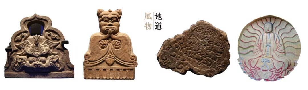 泉州市内所留存的一些各宗教石刻,从左至右为:元·基督教尖拱形四翼天使石墓碑、元·印度教恶魔石构件、元·伊斯兰教云月纹石墓顶、元·摩尼教摩尼光佛石造像。图/《地道风物·闽南》