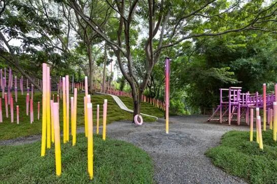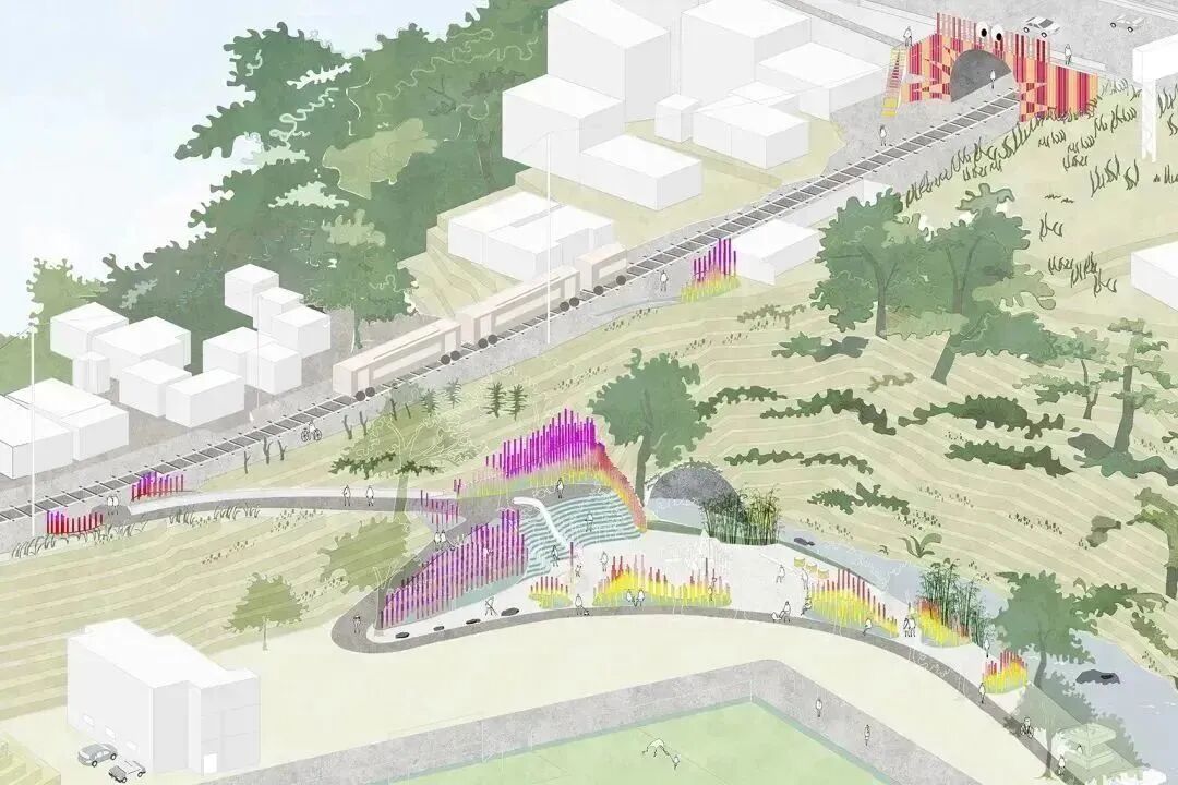一片被绘制成黄、金橘、粉红和紫色的渐变竹林创造出一条蜿蜒的小路,将公园的主要节点与附近的铁路连接起来。场地被形态各异的草坪进一步塑造,这些草坪还作为不同模块竹林的基座。该装置占地总面积约2,000平方米,包括600个填充有砾石和碎石的再生轮胎(用作防洪土墩和土壤固持)和总长约1,200米的竹子。