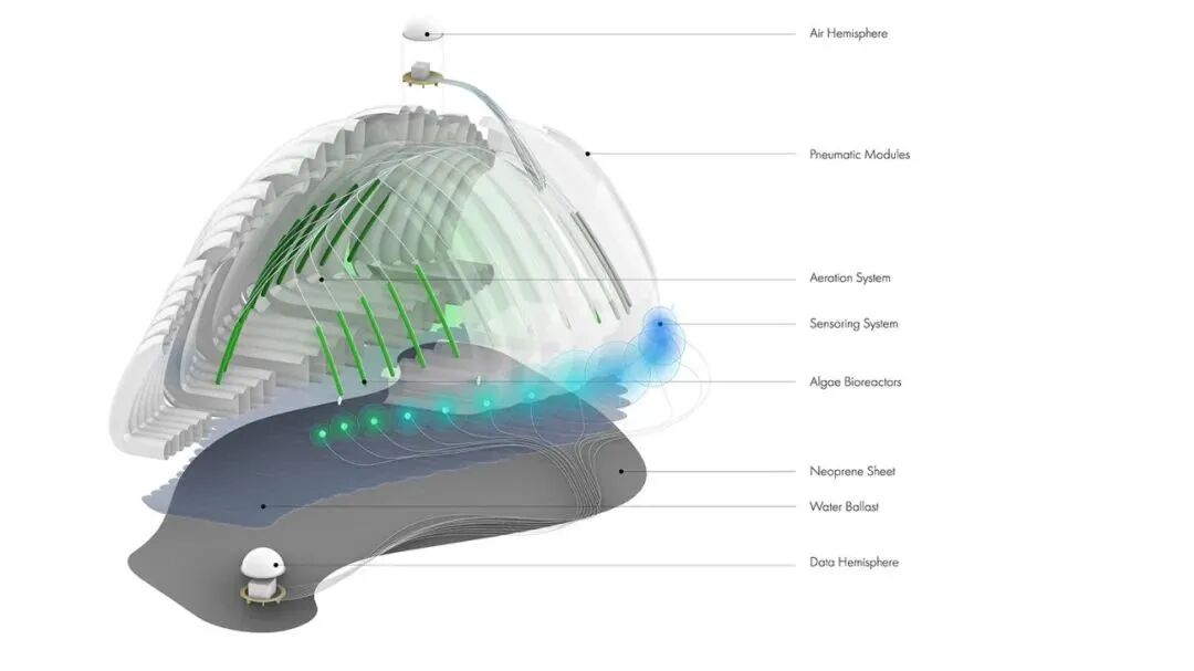 露天的膜结构通过一排感应器进行实时监测,能够感知风并引起充气结构的振动。灵敏的培养灯阵列将被这些传感器激活,反过来支持藻类的光合作用,提高空气净化的能力。整个生物数字有机体进化出一种新的共生关系:人们与装置的互动越多,空气就被净化得越干净。