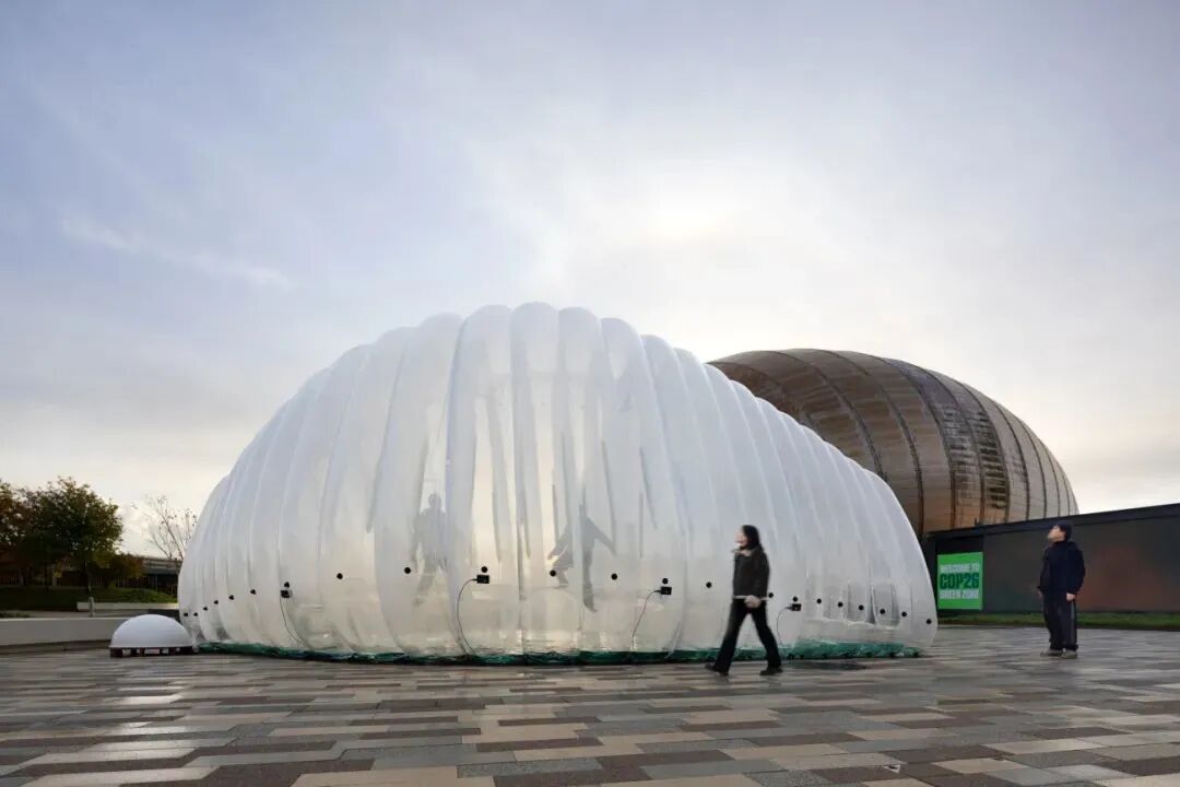 ecoLogicStudio团队带来了名为“气泡”的空气净化生态机,它安装在格拉斯哥科学中心前COP26绿区区域内。“空气泡泡”由99%的空气、水以及具有空气净化功能的小球藻培养物构成,是一款气动生物反应器,每分钟过滤100升受污染的城市空气。