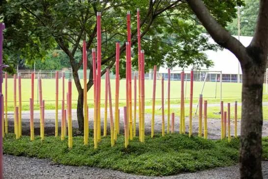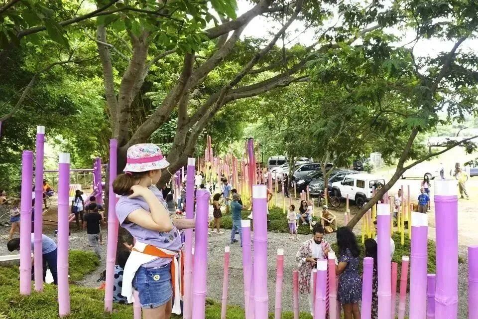 彩色竹子装置成为当地公共活动的发生地