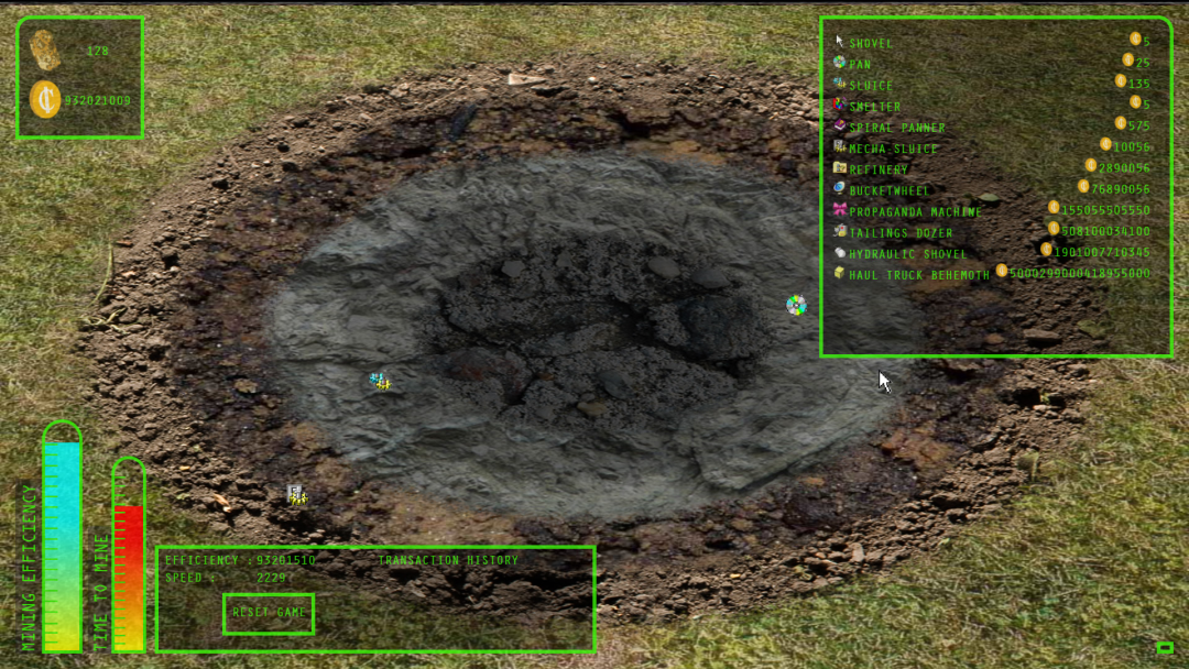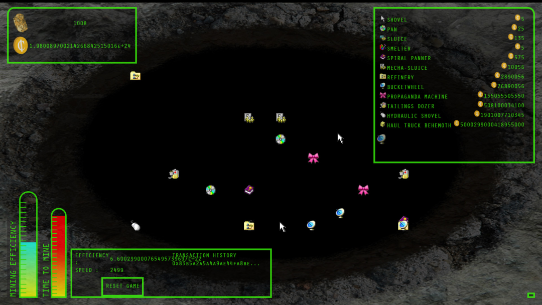 《点击挖矿》是一个基于区块链的点击游戏,玩家每点击一次,就能挖出一个恶性通货膨胀的代币,并购买一系列的动力装置。所创造的代币在各方面都是“真实”的--除了它被设计成在几个方面都没有价值。《点击挖矿》讽刺了ICO、点击工作和点击农场的牛市,解读了加密货币世界中价值产生的基本假设,并使通过点击产生的无用财富比以往任何时候都更有实际意义。