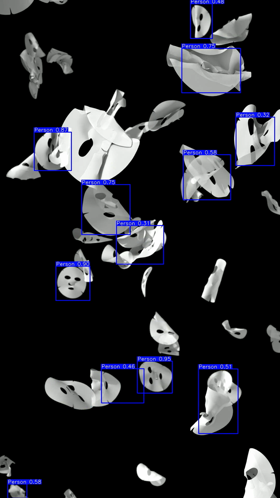 这次展览中呈现的是我的作品《自由落体》,其中由计算机模拟而成的纯白面膜无限下坠,纵向连接的显示屏幕呈现了作品自上而下的观看视角。作品的另一层画面则由机器视觉识别系统构成,即对影像内容的监控与识别,系统根据面部识别算法判断画面中坠落的面膜是否与人脸的特征吻合,蓝色显示框内,不断在“0–1”区间浮动的数值则代表了被机器辨别出的 “人” 与 “真实人类” 的近似值。作品中坠落的“面膜”既是对面部处理、数字滤镜等产物的物理体现,也是数据洪流时代中“人”的缩影。