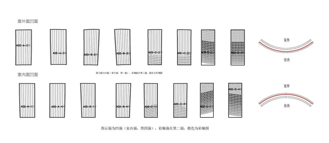 彩釉图案在不同类型的多曲玻璃上打印面同样不同。对于室外面内凹和室外面外凸的玻璃,彩釉会分别打印在第三玻璃面和第二玻璃面上。同时由于曲面双层玻璃的内外面并不等大,图案也会针对打印面进行相应的尺寸缩放,在厂家单位及幕墙深化顾问的协调下,依据内外玻璃尺寸系数进行图案校对和控制。