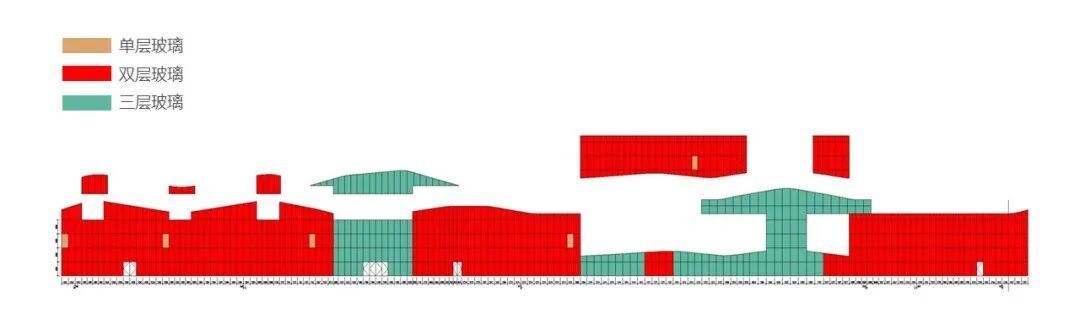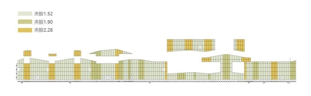 深化设计通过对玻璃参数的分区控制,实现进一步成本控制。对有背衬墙体的幕墙采用双层夹胶玻璃,无背衬墙体的通透空间为夹胶中空的玻璃,且夹胶厚度依据玻璃类型区分。